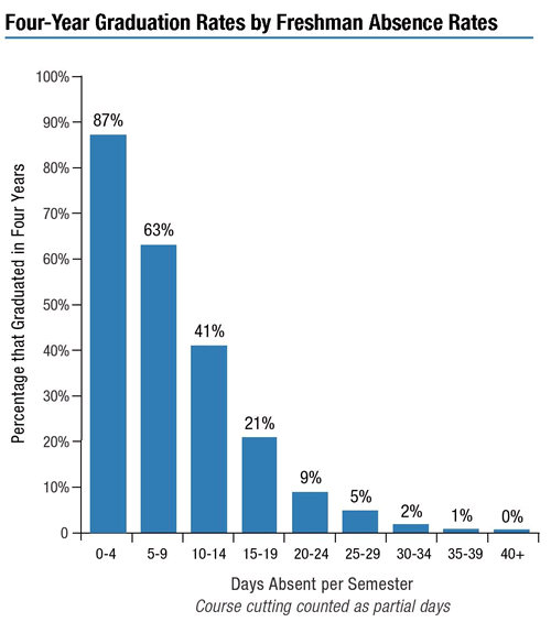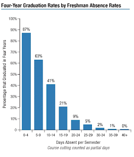One important research question is whether there are behavioral or structural factors that predict or cause low performance by groups of students. Here is a fascinating graph of high school graduation rates broken down by freshman-year absenteeism (MDRC report). Important research is being done at the Center for the Social Organization of Schools at Johns Hopkins on the dropout crisis in urban schools (link). (Here is an earlier post on CSOS and its recommendations for improving dropout rates from urban high schools.) The topic is important because research findings like these may offer indications of the sorts of school reforms that are most likely to enhance school success and graduation.