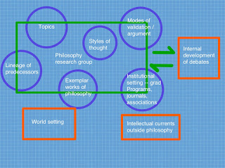 The diagram is intended to be a way of visualizing a philosophy research tradition at a moment in time. The unit of production, the philosophy research group, is steeped in a conventional specification of the important topics; it is skilled in a specific set of modes of argument; it holds out a set of exemplary philosophical works from the history of the discipline as currently understood; it operates in a space that may include other research groups pursuing different topics and methods; and it functions within a set of institutions -- graduate programs, journals, tenure processes, associations, prizes -- that train, valorize, and rank various individuals and their products. Each aspect of these "internal" features is amenable to concrete historical and sociological investigation; we can seek to trace out the institutions, discover the order and rationale of the topics, etc.