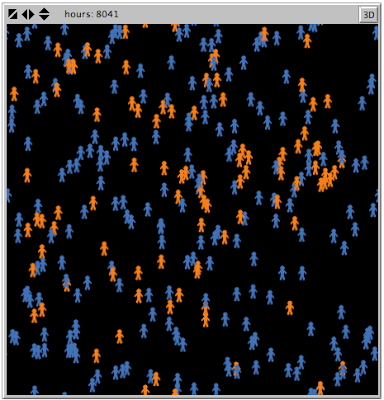 This exercise makes a couple of points. First, agent-based models have the virtue of being very explicit about the logic of action that is represented. So it is possible for anyone to review the code and to modify the assumptions, or to introduce factors that perhaps should be considered. (NetLogo is particularly welcoming to the non-expert in this regard, since it is easy to go back and forth between the code and the graphical representation of the model.)