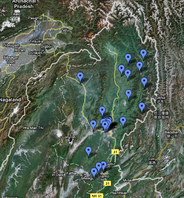 Here I'm going to focus on one cluster -- the Kachin region in north Burma -- and simply reproduce the items that have come through in the past month. Here are the posts that are tagged on the map of north Burma above. Does this begin to give a somewhat coherent view of what is happening in this part of Burma?